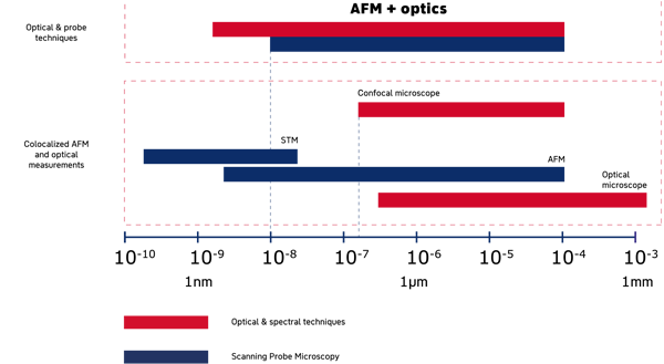Confocal photoluminescence and Raman measurements can be done simultaneously with SPM measurements on the same sample area providing information on the chemical compounds of the sample, its crystal structure, its orientation and deformation, impurities and defects, conformation of macromolecules, etc.