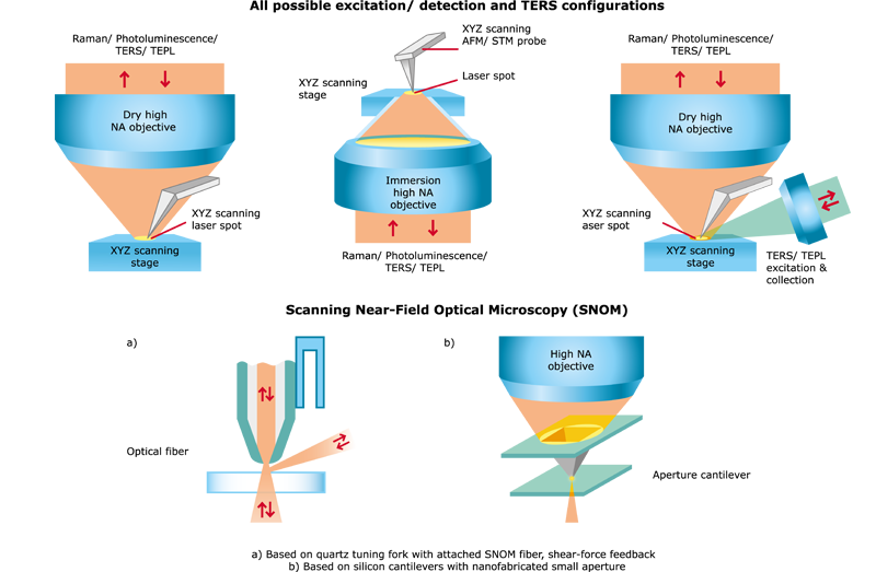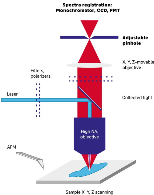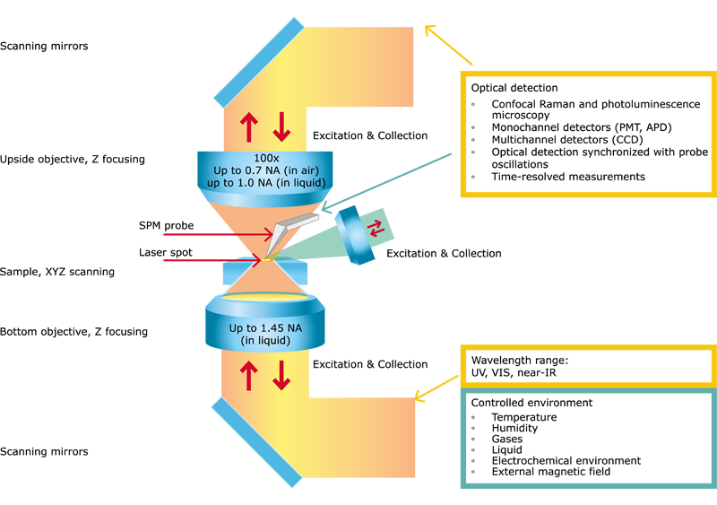 Confocal photoluminescence and Raman measurements can be done simultaneously with SPM measurements on the same sample area providing information on the chemical compounds of the sample, its crystal structure, its orientation and deformation, impurities and defects, conformation of macromolecules, etc.