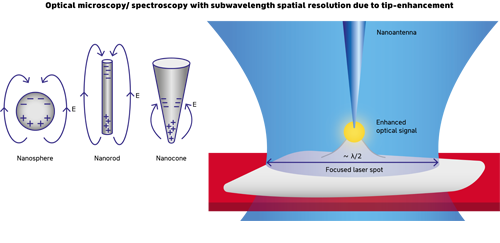 The NTEGRA Spectra optical scheme provides the light-paths from the source to the probe and to the sample, and for recording the emission radiation, optimized in design to maximize the gain of the useful signal. The instrument can get the emission signal from a localized spot few nanometers in diameter on the sample surface directly under the probe tip. Even single molecules can be detected and recognized from their spectra this way. The lateral resolution of Raman (TERS) and photoluminescence (TEPL) maps taken by the NTEGRA Spectra is no longer restricted by the Abbe diffraction limit and can be less than 10 nm.