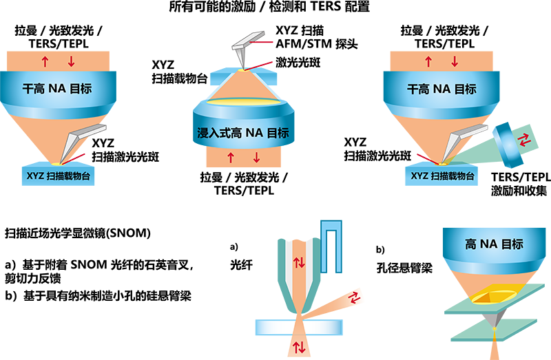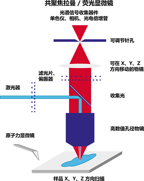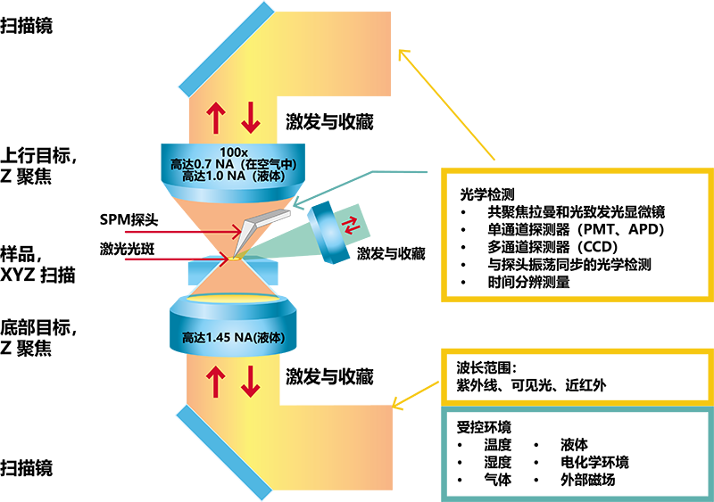 共聚焦光致发光和拉曼测量可以与 SPM 测量在同一样品区域同时进行,提供有关样品的化学成分、晶体结构、取向和变形、杂质和缺陷、大分子构象等信息。